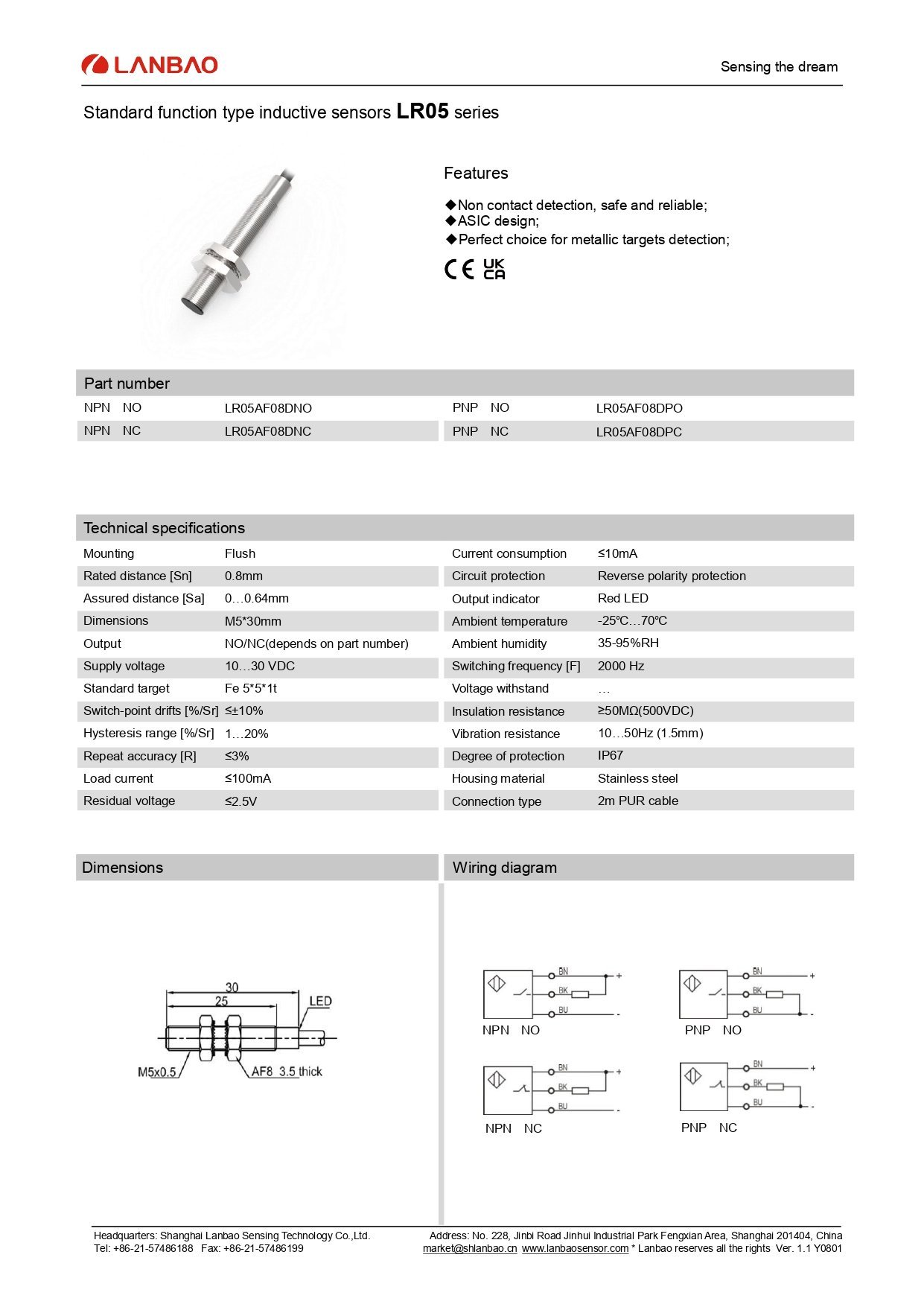 LANBAO LR05TAF08DPC M5 0.8mm PNP NC 10–30VDC Kablolu İndüktif Sensör